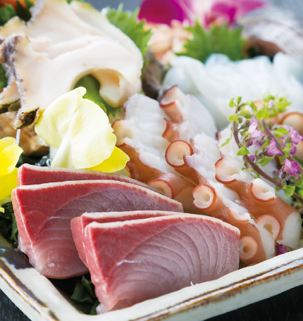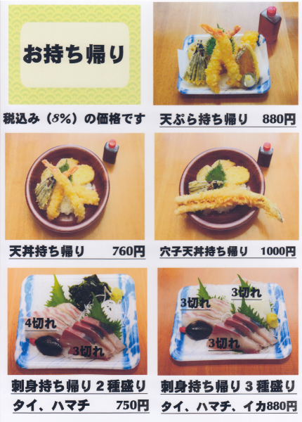 天丼・天ぷら盛り合わせ、お刺身三種盛り合わせ、お持ち帰りできます。