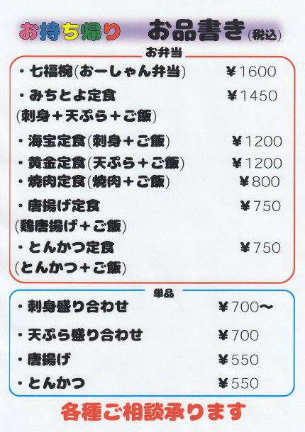 うどん、ラーメン以外のメニューはテイクアウトできます。