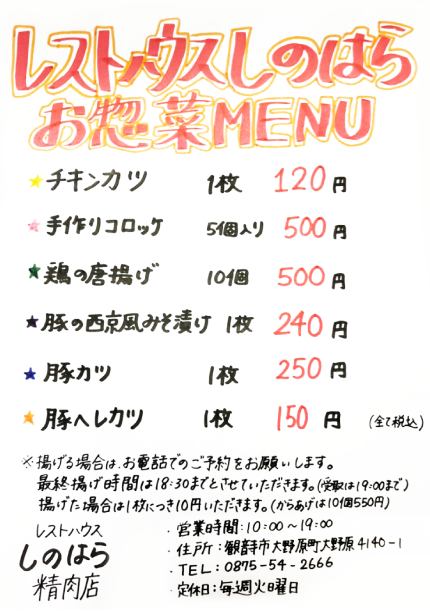 その他ごはん類 、惣菜、天ぷら、おでん持ち帰り可。